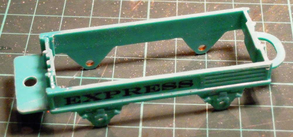 ... and I then used a razor saw to carefully remove the false wheels that were moulded onto the boxcar's wheel flanges.