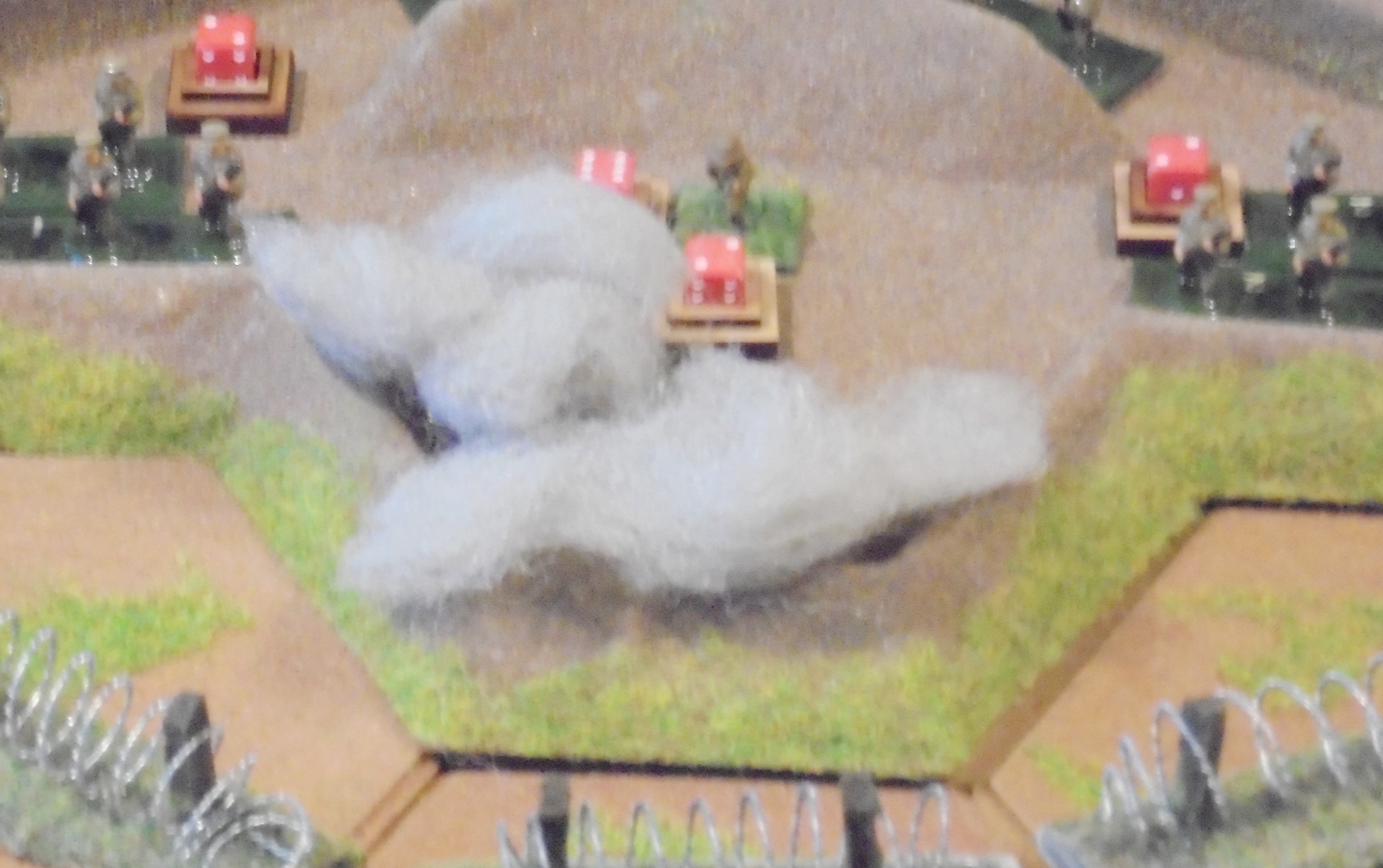 At this point both sides had reached their Exhaustion Points (the San Theodorans had lost 8 SPs and the Nuevo Ricans had lost 14 SPs), and the battle ground to a halt. The Nuevo Rican attack had almost succeeded, but the initial artillery bombardment had not weakened the San Theodorans sufficiently, and the barbed wire had stopped them reaching the San Theodoran trenches. As night fell, the Nuevo Ricans withdrew to their trenches to restock their ammunition supplies and to await reinforcements. Whilst they did so, they could hear the sound of the San Theodorans repairing the damage their trenches had suffered during the fighting.